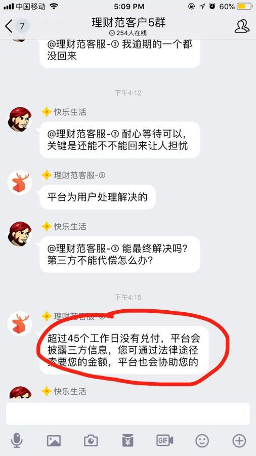 理财范 2018.8.21-19:04……超过45个工作日没有兑付,平台会披露三方信息,您可通过法律途径索要您的金额