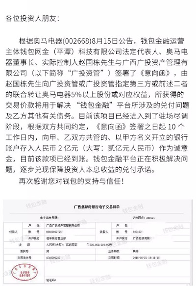 钱包金融 2018.8.22-19:22……关于赵国栋先生向广投资管转让奥马电器股份的进展公告