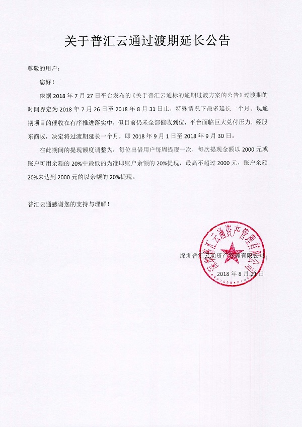 普汇云通 2018.8.21-18:17……关于普汇云通平台过渡期延长公告……平台面临巨大兑付压力,过渡期延长一个月