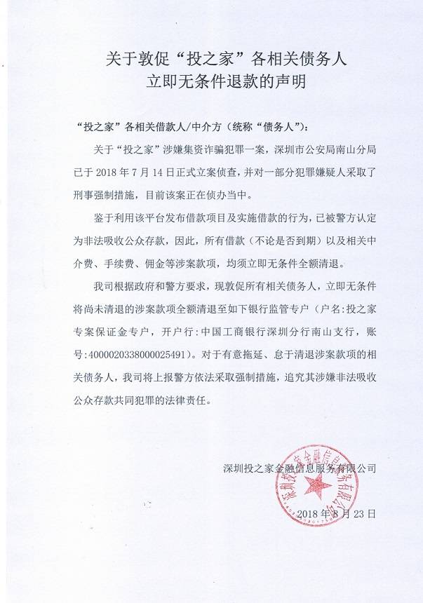投之家 2018.8.23-18:26……关于敦促“投之家”各相关债务人立即无条件退款的声明……警方已认定投之家非法吸收公共存款,因此,所有借款(不论是否到期)以及相关中介费,手续费,佣金等涉案款项均须立即无条件清退,清退至户名为“投之家专案保证金专户”的银行监管账户,对于有意拖延,怠于清退涉案款项的相关债务人,将上报警方依法采取强制措施。追究其涉嫌非法吸收公共存款共同犯罪的法律责任
