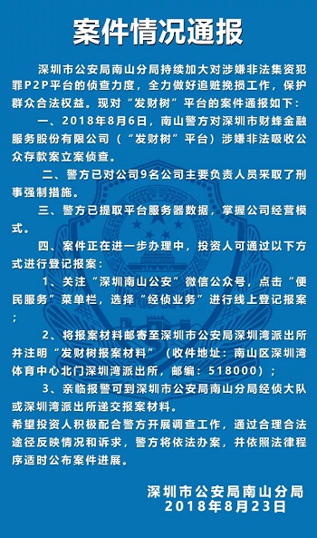 财蜂发财树 2018.8.24-9:47……关于对“发财树”平台的案件情况通报……深圳南山公安对财蜂发财树平台涉嫌非法吸收公众存款立案侦查……警方已对公司九名主要负责人员采取刑事强制措施
