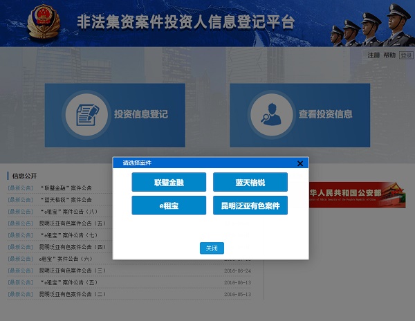 公安部非法集资案件投资人信息登记平台(http://ecidcwc.mps.gov.cn/port/index)