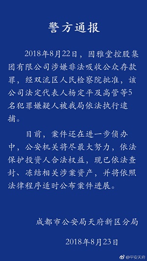 雅堂金融 2018.8.23-18:35……雅堂控股集团有限公司法定代表人杨定平等已被我局依法执行逮捕。目前,案件还在进一步侦办中