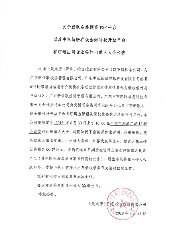 新联在线 2018.8.27-11:27……关于新联在线网贷P2P平台以及中京新联在线金融科技开放平台有序退出网贷业务的出借人大会公告