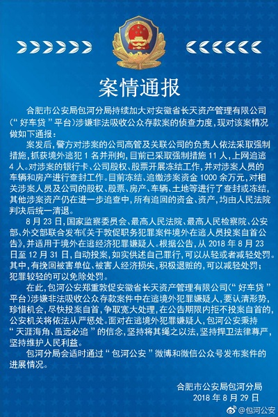 好车贷 2018.8.29-15:39……包河分局发布P2P平台“好车贷”的案情通报……已抓获境外逃犯1名并刑拘,已采取强制措施11人,上网追逃4人……敦促“好车贷”涉案在逃境外的犯罪嫌疑人,认清形势,尽快投案自首