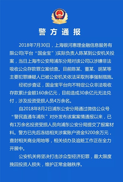 国金宝 2018.8.31-12:50……关于上海银河惠理金融信息服务有限公司(平台“国金宝”)涉嫌非法吸收公众存款案的最新进展……国金宝平台向不特定公众非法吸收存款累计金额160余亿元,目前造成30余亿元无法兑付,涉及投资受损人员4万余名