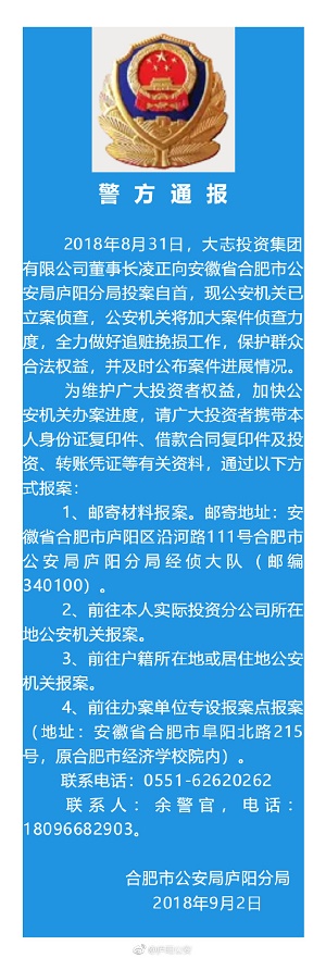根据合肥市公安局庐阳分局官方微博消息,8月31日,大志投资集团有限公司董事长凌正向安徽省合肥市公安局庐阳分局投案自首,称其公司资金链断裂,目前无法按兑付;目前公安机关已对该事件立案调查,呼吁投资人尽快报案。