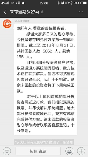 来存吧 2018.8.31-22:11……因不可抗客观因素导致延迟,我们十分抱歉,剩余未回款的投资者将于下周完成回款
