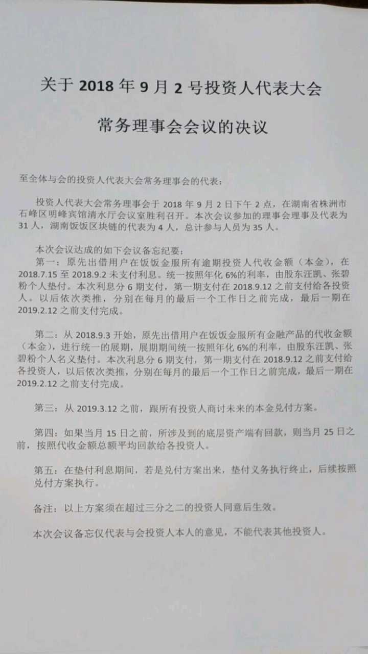 饭饭金服 2018.9.3-21:40……饭饭金服借代会对于平台兑付方案的声明……方案已无法取得三分之二多数同意,根据章程规定,方案无法通过,饭饭公司单方面公布的方案,借代会不予承认……借代会严正告诫饭饭金服公司及其股东和高管人员,一再考验广大出借人的耐心,最终将丧失一切机会