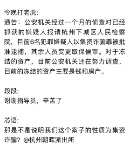 叮叮理财 2018.9.3-17:26……目前6名犯罪嫌疑人以集资诈骗罪被批准逮捕……对于冻结的资产,目前公安机关还在努力调查