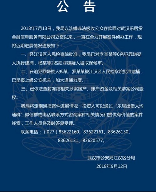 乐居财富 2018.9.12-11:58……我局已对李某某等6名犯罪嫌疑人执行逮捕,杨某等2名犯罪嫌疑人被取保候审……已依法查封冻结相关涉案房产、账户资金及相关涉案公司股权
