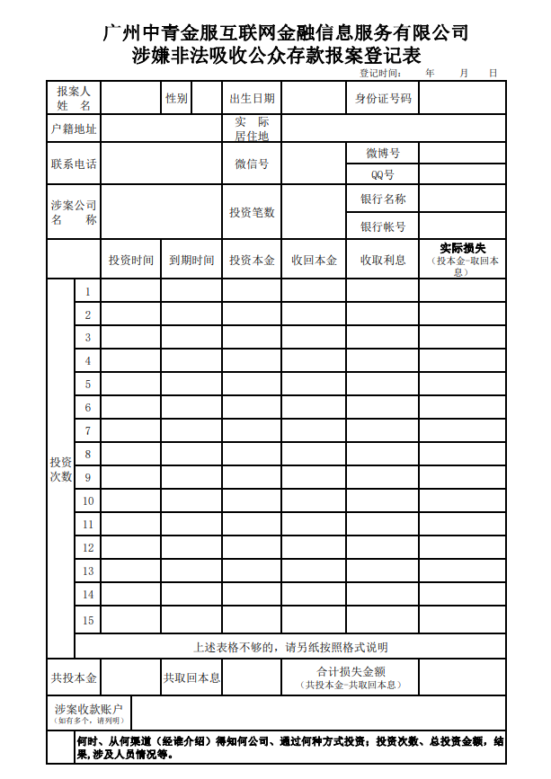中青金服 2018.9.13-17:28……我大队已立案侦办广州中青金服互联网金融信息服务有限公司涉嫌非法吸收公众存款案,请准备以下资料到广州市公安局天河区分局经济犯罪侦查大队报案……外地投资人请到户籍所在地或常驻地公安机关报案,也可以通过 EMS 邮寄报案,要求一个邮件一份报案材料
