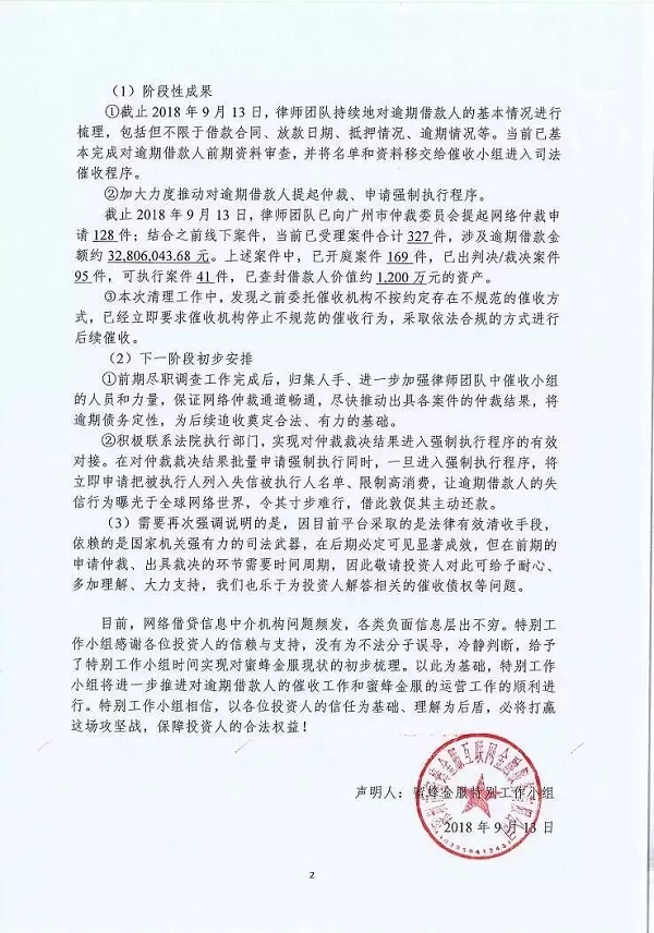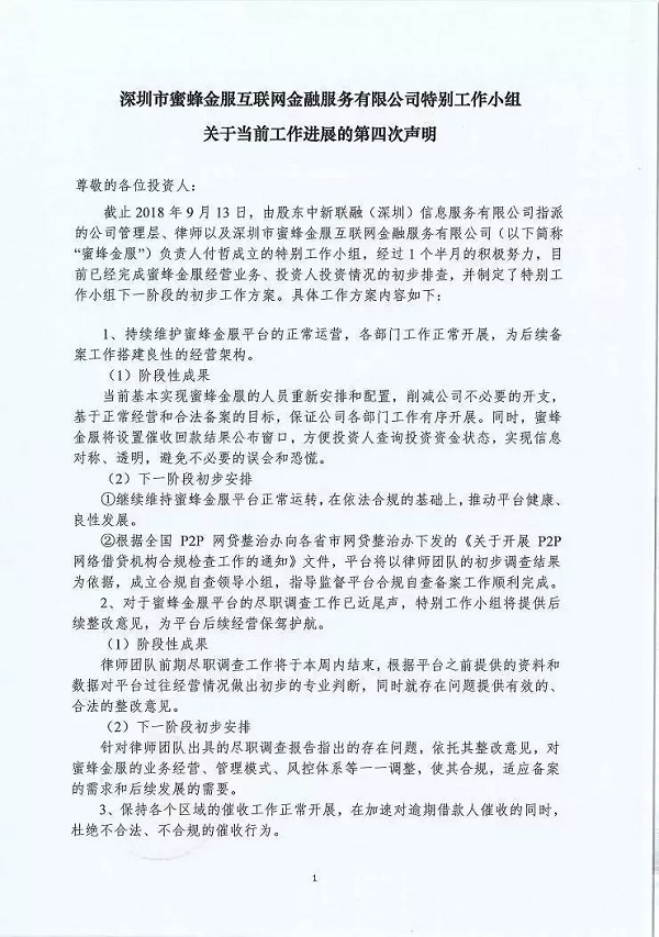 蜜蜂有钱 2018.9.15-15:03……蜜蜂金服特别工作小组关于当前工作进展的第四次声明……截止 2018 年 9 月 13 日,由股东中新联融(深圳)信息服务有限公司指派的公司管理层、律师以及深圳市蜜蜂金服互联网金融服务有限公司(以下简称“蜜蜂金服”)负责人付哲成立的特别工作小组,经过1个半月的积极努力,目前已经完成蜜蜂金服经营业务、投资人投资情况的初步排查,并制定了特别工作小组下一阶段的初步工作方案