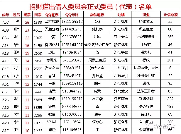 招财猫 2018.9.15-23:11……喵友们,出借委代表(委员)名单正式公布啦……经过为期两周的网上报名、公选投票、网票公示、现场会议、再次票选等相关工作,招财猫出借人委员会选举工作终于落下帷幕