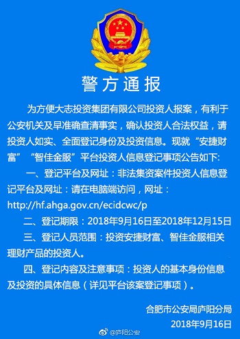 安捷财富(浩禄金融)、智佳金服 2018.9.16-13:04……为方便大志投资集团有限公司人报案,有利于公安机关及早准确查清事实,确定投资人合法权益,请投资人如实、全面登记身份及投资信息。现就“安捷财富”“智佳金服”平台投资人信息登记事项公告如下
