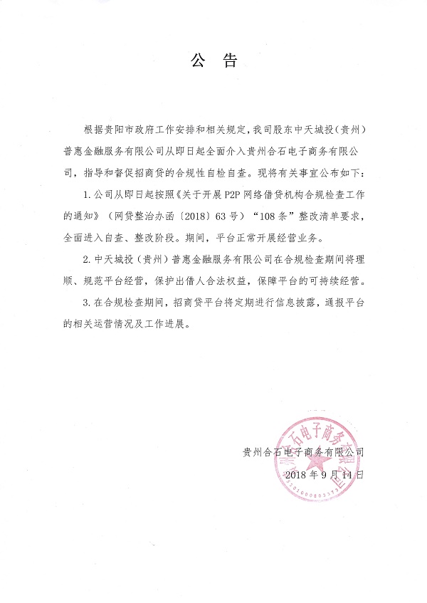 招商贷 2018.9.14-16:46……中天城投从即日起全面介入招商贷,指导和督促招商贷的合规自检自查