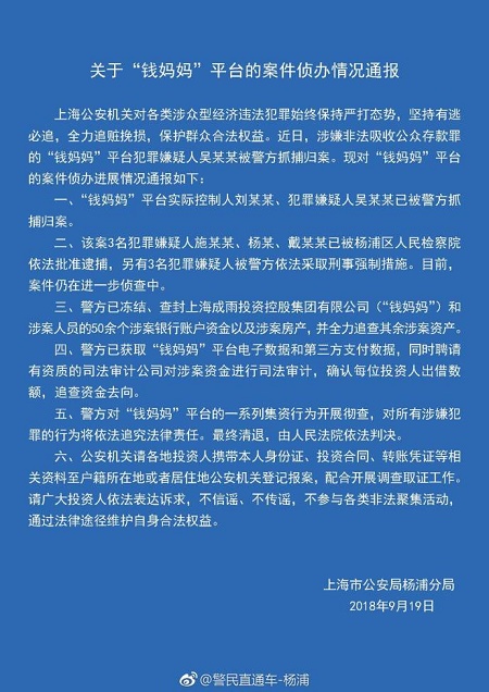 钱妈妈 2018.9.19-13:01……上海市公安局杨浦分局发布关于“钱妈妈”平台的案件侦办情况通报,近日,涉嫌非法吸收公众存款罪的钱妈妈平台实际控制人刘某某、犯罪嫌疑人吴某某已被警方抓捕归案……警方已冻结、查封钱妈妈平台和涉案人员的50余个涉案银行账户资金以及涉案房产,并全力追查其余涉案资产