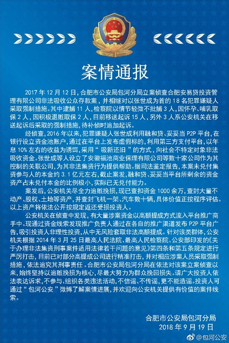 融和贷、妥妥当 2018.9.19-19:02……包河公安目前移送起诉15人…… 张世成等人设立了安徽福池商业保理有限公司等数十家公司作为其控制的关联公司……公安机关查封大量不动产、股权、土地等资产,并查封飞机一架……据司法鉴定报告,本案未兑付集资参与人的本金约3.1亿元……公安机关依法已对部分高提成公司进行精准打击,并对相应涉案人员采取强制措施