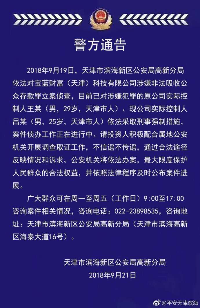 八条鱼 2018.9.21-22:47……2018年9月19日,天津市滨海新区公安局高新分局依法对八条鱼平台涉嫌非法吸收公众存款罪立案侦查,目前已对原公司实际控制人王某(29岁)、现公司实际控制人吕某(25岁)依法采取刑事强制措施