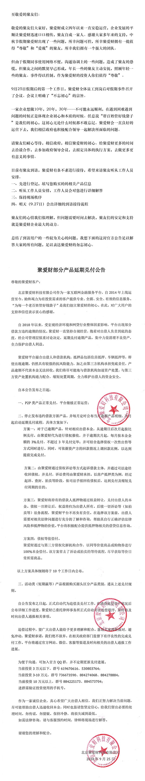 聚爱财 2018.9.26-12:20……聚爱财部分产品延期兑付公告