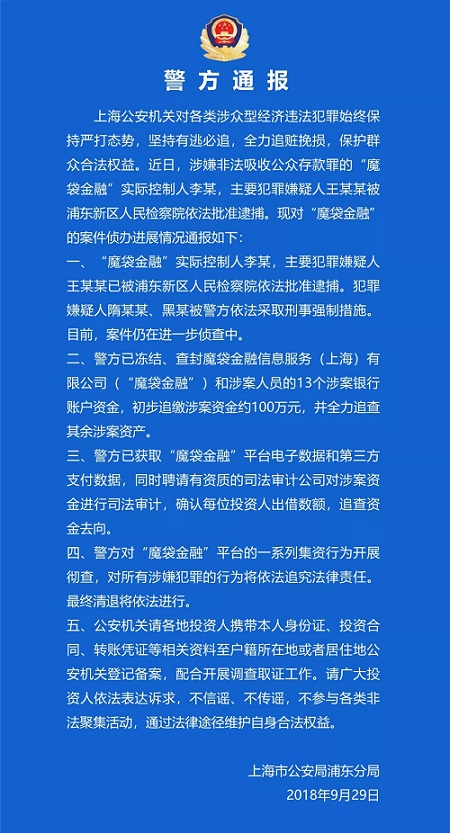 魔袋金融 2018.9.29-12:13……关于魔袋金融信息服务(上海)有限公司(“魔袋金融”)涉嫌非法吸收公众存款案的最新进展……犯罪嫌疑人随某某、黑某被警方依法采取刑事强制措施……初步追缴涉案资金100万元