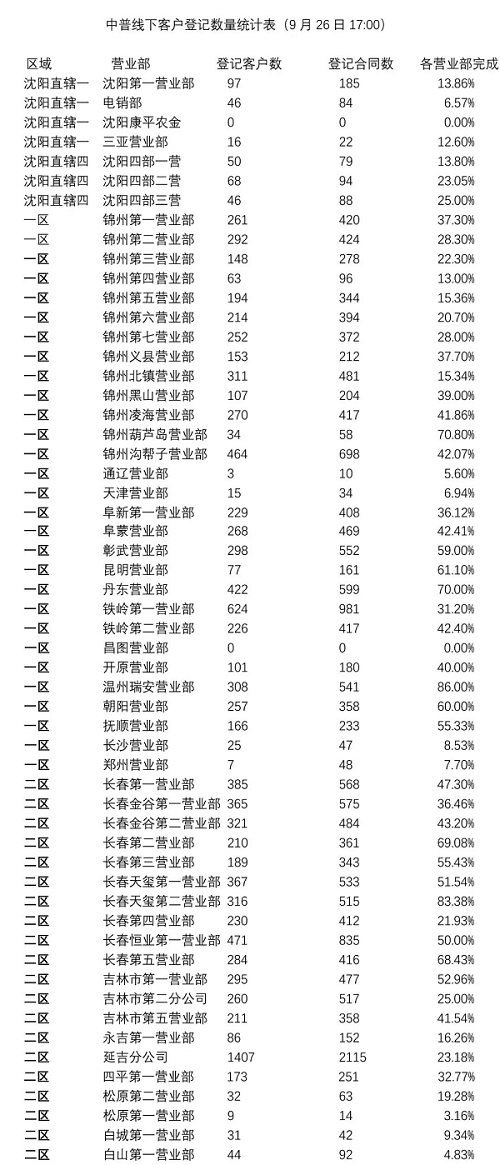 中普金服 2018.9.29-17:57……中普线下登记工作进程通告……中普线下登记工作从9月18日开始进行测试,期间经过数次数据的调整,目前已经开始全面展开,目前累计登记客户人数16223人,登记合同26595笔。沈阳直辖一区完成率21.69%;直辖四区完成率22.01%;第一大区完成率33.93%;第二大区完成率32.27%;第四大区完成率19.58%;第五大区完成率16.76%。总登记人数占公司总在账客户的27.87%