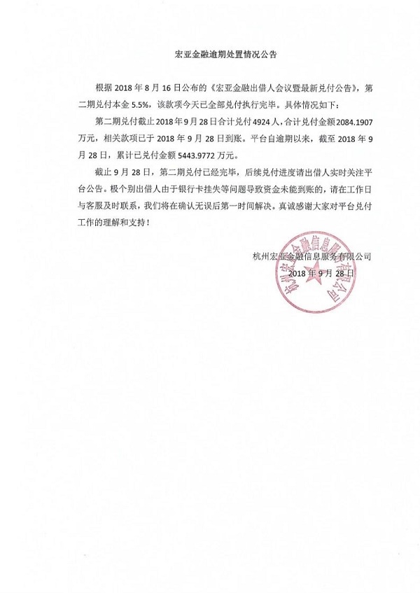 宏亚金融 2018.9.28-16:27……宏亚金融第二期兑付本金5.5%执行完毕,合计兑付2084.1907万元
