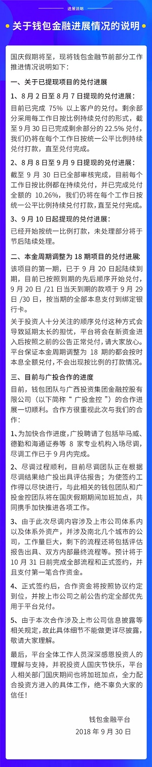 钱包金融 2018.9.30-20:46……关于钱包金融进展情况说明……钱包金融节前工作推进情况说明