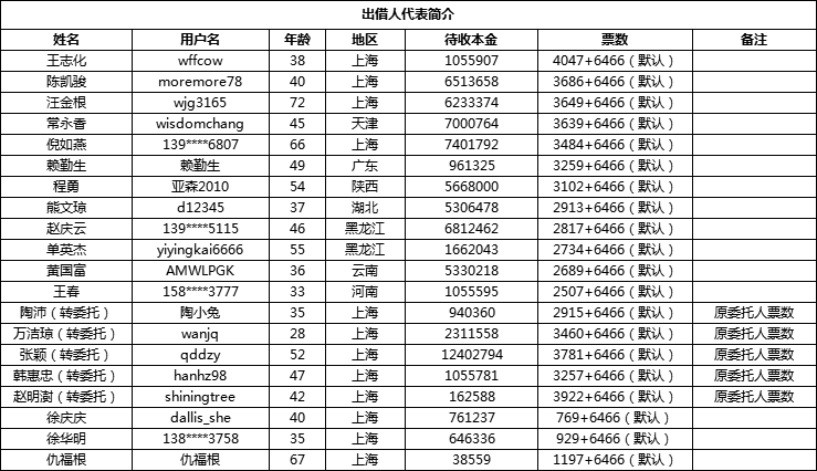 根据《关于出借人推选代表成立出借人代表大会及其授权公告》及《选举出借人代表通知》的情况,出席本次出借人代表大会20名出借人代表名单公布如下:
