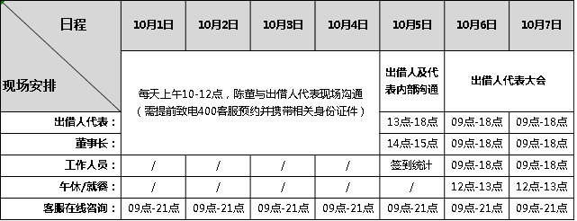 (2)大会时间:2018年10月6日至7日,根据实际情况可顺延1天,10月5日下午为出借人及代表内部之间现场沟通。