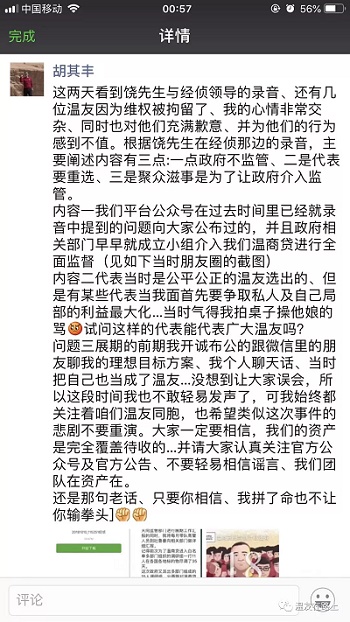 您好,我是一位投了10万多的出借人,虽然我的不多,但也是5-6年来存下的血汗钱。当我10月13号看到团长在群里的您的朋友圈,我很欣慰,现在至少有一个信息窗口来传达。我有几句话对您,也不知道您能看到吗,我还是想对您说。