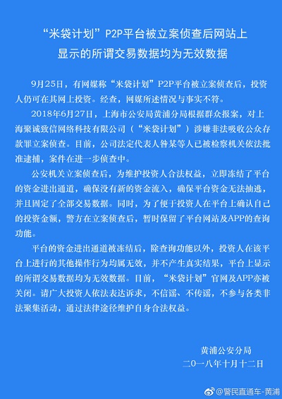 米袋计划 2018.10.12-12:08……案情通报“米袋计划”P2P平台被立案侦查后网站上显示的所谓交易数据均为无效数据
