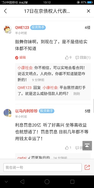 回复的人 没有nong si ni 就算不错了。 作为出借人,在此关键时刻,应该团结一致,乱发言论是几个意思,你要觉得标的不真实,可以去公司实地考察。毫无根据这样猜测会对平台造成很大中伤的。难道人言可畏你不知道?