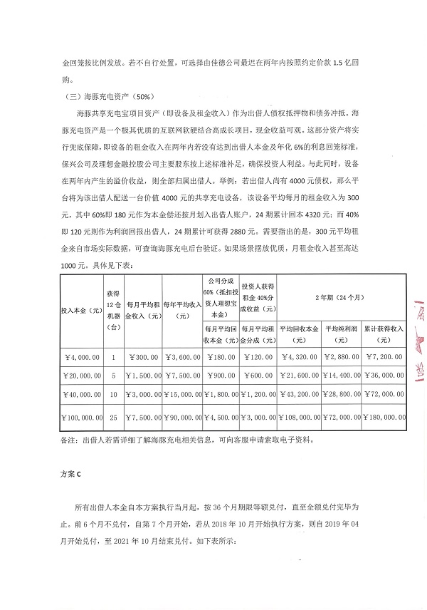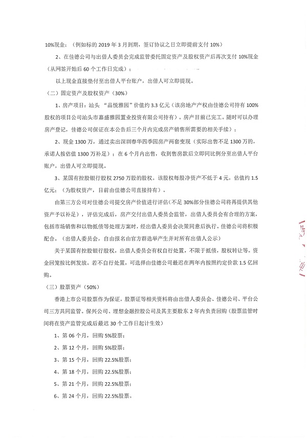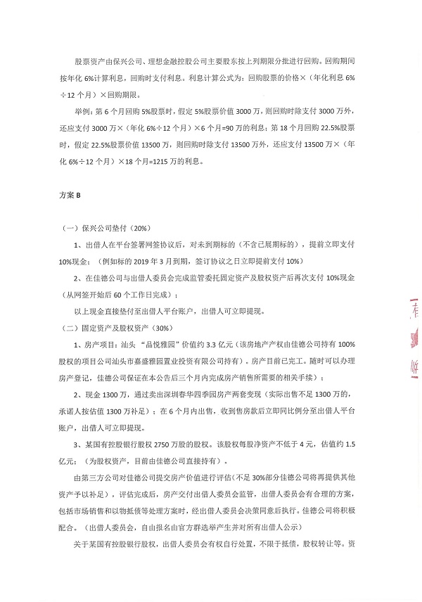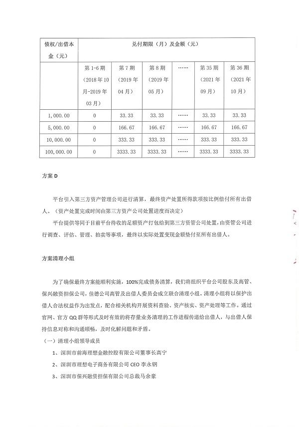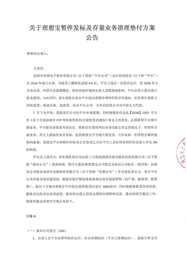 理想宝所有借款项目均由第三方机构深圳市保兴融资担保有限公司(以下简称“保兴公司”)提供担保。垫付方案征得理想宝公司股东及保兴公司股东一 致同意,由保兴公司股东深圳市佳德投资有限公司(以下简称“佳德公司”)作为债权受让方,受让平台公司目前全部存量债权,根据市场行情标准提供相应有价抵质押物(房产类,股权类,股票类),按以下方案对理想宝平台现全部存量项月进行100%垫付;同时根据借款项目的还款、催收及法院诉讼处理进度,按全体出借人投资总额同比例即时还款,最长时间不超过三年。