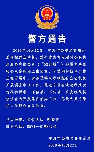 53财服 2018.10.22-16:51……宁波鄞州警方对宁波杰邦互联网金融信息服务有限公司53财服平台涉嫌非法吸收公众存款案立案侦查,目前案件侦办工作正在开展中