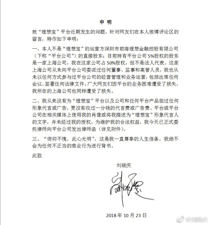 理想宝 2018.10.23-23:31……刘晓庆关于“理想宝”平台相关问题的申明:我不知情,和我无关撒,别来烦我,我也是受害者