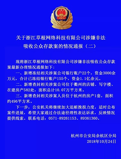 草根投资 2018.10.24-12:30……关于浙江草根网络科技有限公司涉嫌非法吸收公众存款案的情况通报(二)