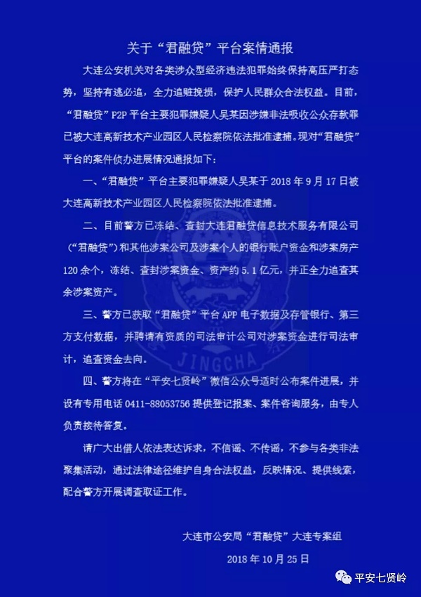 大连市公安局“君融贷”大连专案组现对“君融贷”平台案情侦办进展情况通报如下: