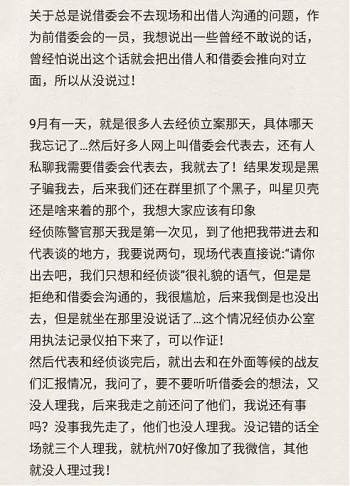 答:借委会的成员都是普普通通的出借人,我们不是神,不能想做什么就做什么,更不能手眼通天。借委会每个人也有自己的家庭,也有自己的工作,甚至家里还有病人要照顾。而且,借委会成员还要承担很多风险,大家也并不给借委会发工资,借委会成员不能为了WQ而抛妻(夫)弃子。如果你觉得你可以,那欢迎你加入借委会,为拿回自己的钱出一份力,不要只做一个键盘侠。
