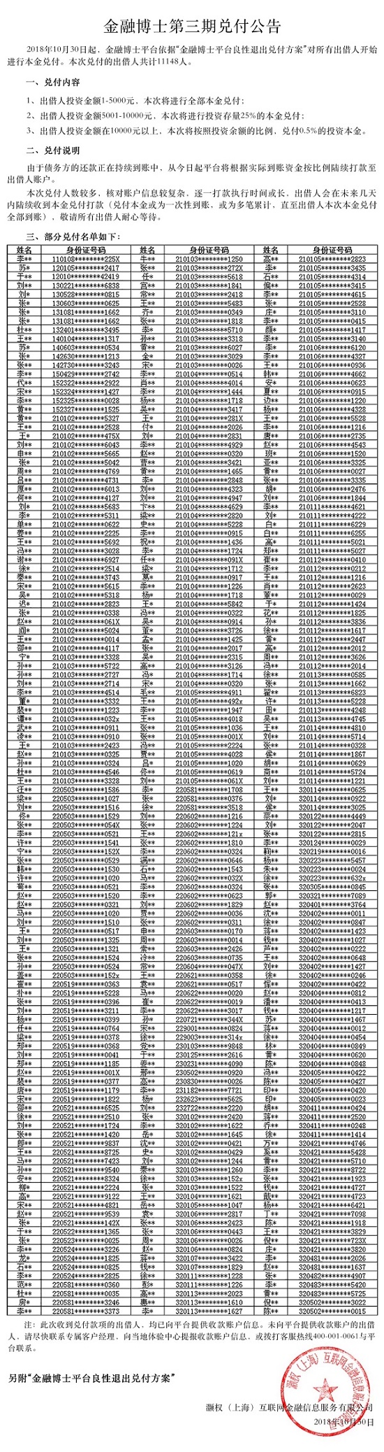 金融博士 2018.10.30-19:33……金融博士第三期兑付公告,本次兑付的出借人共计11148人,出借人投资金额在1万元以上,本次将兑付0.5%的本金