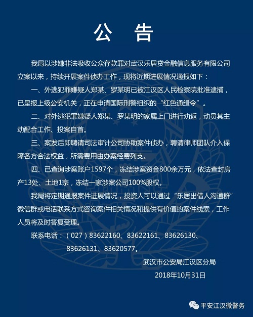武汉乐居贷 2018.10.31-10:21……武汉乐居贷非法吸收公众存款案近期进展情况通报 外逃犯罪嫌疑人正在申请红通……冻结涉案资金800余万,房产13处,土地一宗,冻结一家涉案公司100%股权