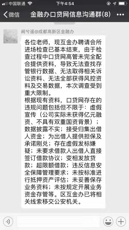 口贷网 2018.10.31-13:55……各位老师,现互金办聘请会所进场检查已基本结束,由于检查过程中口贷网高管未完全配合,本次调查受到重大限制。根据现有资料,口贷网存在的违规问题包括但不限于,区互金办已将相关线索移交公安机关