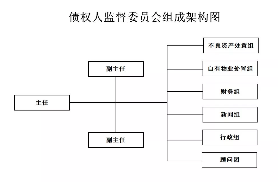 第九条 债委会设置5个小组和顾问团,5个小组分别为:不良资产处置组、自有物业处置组、财务组、新闻组、行政组,各组选举组长负责与东融系相应负责人对接具体事务。