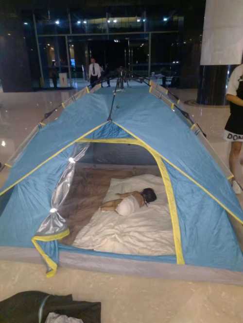 保安就以为我不敢在那住、其实我早就准备要住在他们公司了,我去车里拿出了被子枕头煤气炉宝宝洗澡的盆还有锅、被子一铺就开始烧水、水烧好了开始给宝宝洗澡、宝宝澡洗好了又在大堂给宝宝煮饭吃、吃完已经8点多了哄宝宝睡觉、宝宝睡了就给把宝宝放在帐篷里睡觉、保安一看这架势急了、说领导说了要给你放行、我说晚了我不走了、就在这住了还没开酒店。