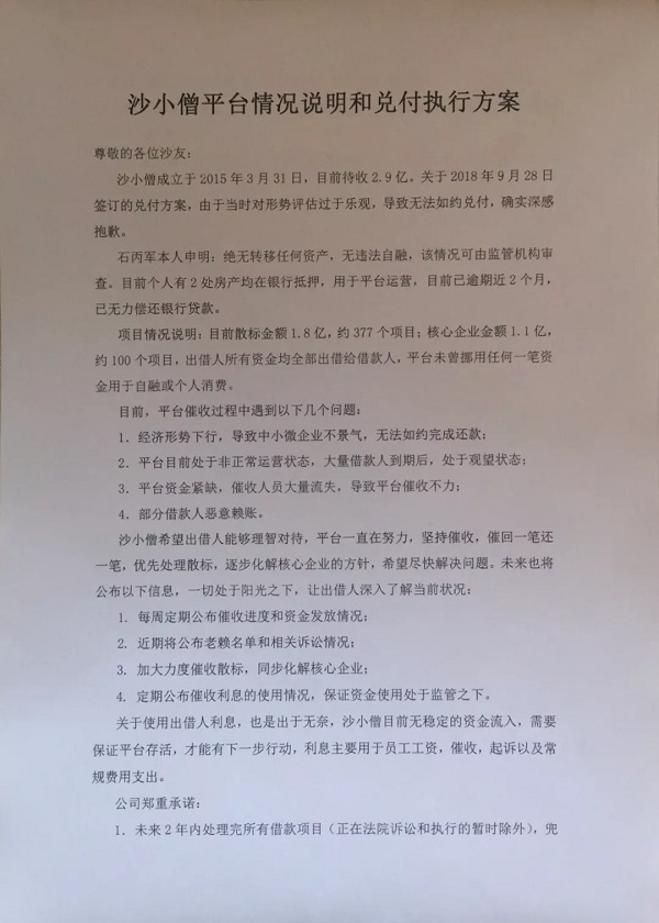 沙小僧 2018.11.17-20:55……沙小僧平台情况说明和兑付执行方案