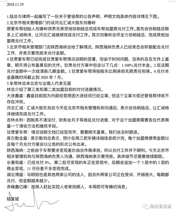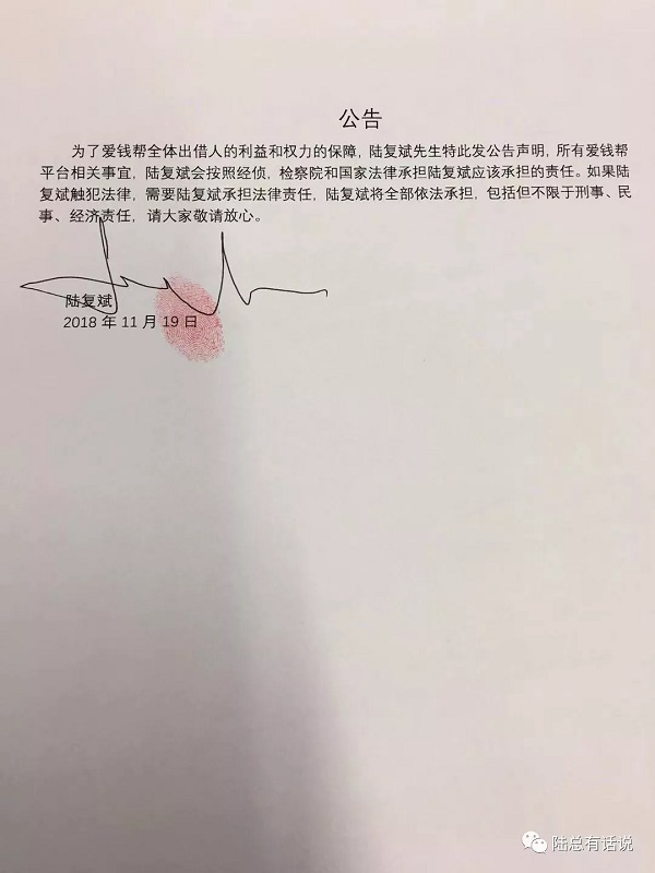 爱钱帮 2018.11.19-20:39……2018.11.19工作日报……为了爱钱帮全体出借人的利益和权力的保障,陆复斌先生特此发公告声明,所有爱钱帮平台相关事宜.陆复斌会按照经侦,检察院和国家法律承担陆复斌应该承担的责任。如果陆复斌触犯法律.需要陆复斌承担法律责任,陆复斌将全部依法承担.包括但不限于刑事、民事、经济渍任,请大家敬请放心。