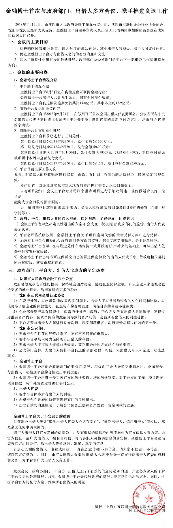 金融博士 2018.11.22-16:58……金融博士首次与政府部门、出借人多方会议,携手推进良退工作
