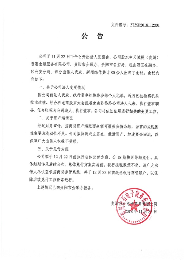 招商贷 2018.11.23-19:00……因前法人陈格路涉嫌个人犯罪,已被检查机构批准逮捕……招商贷拟于12月22日前执行18个月按月等额兑付的方案,并免职此前涉案被批捕的法人,执行董事陈格路。并已将上述问题情况报备金融办