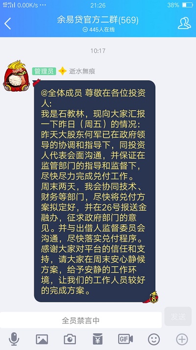 余易贷 2018.11.24-21:28……各位投资人,我是石教林,现向大家汇报一下昨日的情况