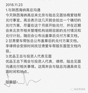 爱钱帮 2018.11.23-20:58……今天陕西海纳高总来北京与陆总见面协商爱钱帮兑付事宜。 高总表示这几天就会给出一个确切的兑付方案,尽量在这个月底开始兑付,并在近期会来北京市相关管理机构说明目前的兑付情况和兑付计划……优品王总下周会与投资人代表,律师,陆总见面沟通兑付相关事情。这周末会与陆总沟通具体见面时间和地点